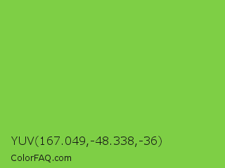 YUV 167.049,-48.338,-36 Color is a normal green color and the nearest color is Kiwi #8ee53f. Hex code #7ecf45 and RGB value is rgb(126,207,69). In RGB color space, this color is composed of 49% red, 81% green, 27% blue, In CMYK color space, this color is composed of 39% cyan, 0% magenta, 67% yellow , 19% black , In HSL color space, this color has a hue angle of 95° , 59% saturation and 54% lightness.