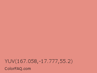 YUV 167.058,-17.777,55.2 Color is a light red color and the nearest color is Dark Salmon #e9967a. Hex code #e68e83 and RGB value is rgb(230,142,131). In RGB color space, this color is composed of 90% red, 56% green, 51% blue, In CMYK color space, this color is composed of 0% cyan, 38% magenta, 43% yellow , 10% black , In HSL color space, this color has a hue angle of 7° , 66% saturation and 71% lightness.