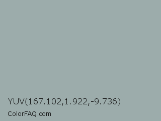 YUV 167.102,1.922,-9.736 Color is a light cyan color and the nearest color is Edward #a2aeab. Hex code #9cacab and RGB value is rgb(156,172,171). In RGB color space, this color is composed of 61% red, 67% green, 67% blue, In CMYK color space, this color is composed of 9% cyan, 0% magenta, 1% yellow , 33% black , In HSL color space, this color has a hue angle of 176° , 9% saturation and 64% lightness.