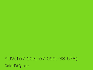 YUV 167.103,-67.099,-38.678 Color is a normal green color and the nearest color is Lima #76bd17. Hex code #7bd81f and RGB value is rgb(123,216,31). In RGB color space, this color is composed of 48% red, 85% green, 12% blue, In CMYK color space, this color is composed of 43% cyan, 0% magenta, 86% yellow , 15% black , In HSL color space, this color has a hue angle of 90° , 75% saturation and 48% lightness.