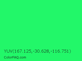YUV 167.125,-30.628,-116.751 Color is a normal green color and the nearest color is Spring Green #00ff7f. Hex code #22f769 and RGB value is rgb(34,247,105). In RGB color space, this color is composed of 13% red, 97% green, 41% blue, In CMYK color space, this color is composed of 86% cyan, 0% magenta, 57% yellow , 3% black , In HSL color space, this color has a hue angle of 140° , 93% saturation and 55% lightness.