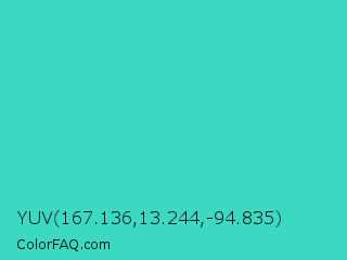 YUV 167.136,13.244,-94.835 Color is a normal cyan color and the nearest color is Turquoise PWG #30d5c8. Hex code #3bd9c2 and RGB value is rgb(59,217,194). In RGB color space, this color is composed of 23% red, 85% green, 76% blue, In CMYK color space, this color is composed of 73% cyan, 0% magenta, 11% yellow , 15% black , In HSL color space, this color has a hue angle of 171° , 68% saturation and 54% lightness.