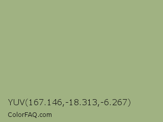 YUV 167.146,-18.313,-6.267 Color is a normal green color and the nearest color is Sage #9ea587. Hex code #a0b282 and RGB value is rgb(160,178,130). In RGB color space, this color is composed of 63% red, 70% green, 51% blue, In CMYK color space, this color is composed of 10% cyan, 0% magenta, 27% yellow , 30% black , In HSL color space, this color has a hue angle of 83° , 24% saturation and 60% lightness.