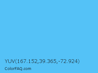 YUV 167.152,39.365,-72.924 Color is a light blue color and the nearest color is Blue Jeans #5dadec. Hex code #54c2f7 and RGB value is rgb(84,194,247). In RGB color space, this color is composed of 33% red, 76% green, 97% blue, In CMYK color space, this color is composed of 66% cyan, 21% magenta, 0% yellow , 3% black , In HSL color space, this color has a hue angle of 200° , 91% saturation and 65% lightness.