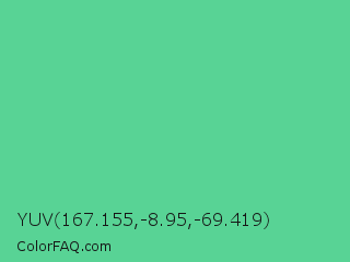 YUV 167.155,-8.95,-69.419 Color is a normal green color and the nearest color is Ocean Green #48bf91. Hex code #58d395 and RGB value is rgb(88,211,149). In RGB color space, this color is composed of 35% red, 83% green, 58% blue, In CMYK color space, this color is composed of 58% cyan, 0% magenta, 29% yellow , 17% black , In HSL color space, this color has a hue angle of 150° , 58% saturation and 59% lightness.