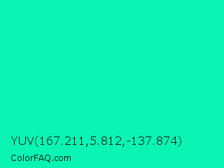 YUV 167.211,5.812,-137.874 Color is a normal green color and the nearest color is Medium Spring Green #00fa9a. Hex code #0af5b3 and RGB value is rgb(10,245,179). In RGB color space, this color is composed of 4% red, 96% green, 70% blue, In CMYK color space, this color is composed of 96% cyan, 0% magenta, 27% yellow , 4% black , In HSL color space, this color has a hue angle of 163° , 92% saturation and 50% lightness.