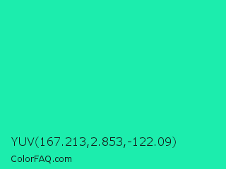 YUV 167.213,2.853,-122.09 Color is a normal green color and the nearest color is Medium Spring Green #00fa9a. Hex code #1cedad and RGB value is rgb(28,237,173). In RGB color space, this color is composed of 11% red, 93% green, 68% blue, In CMYK color space, this color is composed of 88% cyan, 0% magenta, 27% yellow , 7% black , In HSL color space, this color has a hue angle of 162° , 85% saturation and 52% lightness.
