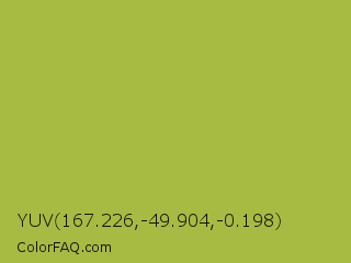 YUV 167.226,-49.904,-0.198 Color is a normal yellow color and the nearest color is Android Green #a4c639. Hex code #a7bb42 and RGB value is rgb(167,187,66). In RGB color space, this color is composed of 65% red, 73% green, 26% blue, In CMYK color space, this color is composed of 11% cyan, 0% magenta, 65% yellow , 27% black , In HSL color space, this color has a hue angle of 70° , 48% saturation and 50% lightness.