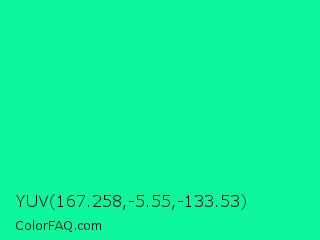 YUV 167.258,-5.55,-133.53 Color is a normal green color and the nearest color is Medium Spring Green #00fa9a. Hex code #0ff79c and RGB value is rgb(15,247,156). In RGB color space, this color is composed of 6% red, 97% green, 61% blue, In CMYK color space, this color is composed of 94% cyan, 0% magenta, 37% yellow , 3% black , In HSL color space, this color has a hue angle of 156° , 94% saturation and 51% lightness.