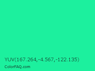 YUV 167.264,-4.567,-122.135 Color is a normal green color and the nearest color is Medium Spring Green #00fa9a. Hex code #1cf09e and RGB value is rgb(28,240,158). In RGB color space, this color is composed of 11% red, 94% green, 62% blue, In CMYK color space, this color is composed of 88% cyan, 0% magenta, 34% yellow , 6% black , In HSL color space, this color has a hue angle of 157° , 88% saturation and 53% lightness.