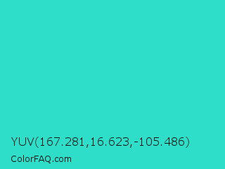 YUV 167.281,16.623,-105.486 Color is a normal cyan color and the nearest color is Turquoise PWG #30d5c8. Hex code #2fdec9 and RGB value is rgb(47,222,201). In RGB color space, this color is composed of 18% red, 87% green, 79% blue, In CMYK color space, this color is composed of 79% cyan, 0% magenta, 9% yellow , 13% black , In HSL color space, this color has a hue angle of 173° , 73% saturation and 53% lightness.