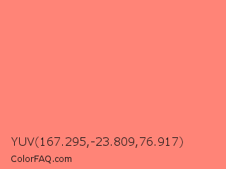 YUV 167.295,-23.809,76.917 Color is a light red color and the nearest color is Tea Rose #f88379. Hex code #ff8477 and RGB value is rgb(255,132,119). In RGB color space, this color is composed of 100% red, 52% green, 47% blue, In CMYK color space, this color is composed of 0% cyan, 48% magenta, 53% yellow , 0% black , In HSL color space, this color has a hue angle of 6° , 100% saturation and 73% lightness.