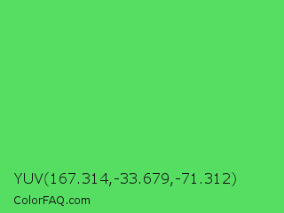 YUV 167.314,-33.679,-71.312 Color is a normal green color and the nearest color is Emerald #50c878. Hex code #56de63 and RGB value is rgb(86,222,99). In RGB color space, this color is composed of 34% red, 87% green, 39% blue, In CMYK color space, this color is composed of 61% cyan, 0% magenta, 55% yellow , 13% black , In HSL color space, this color has a hue angle of 126° , 67% saturation and 60% lightness.