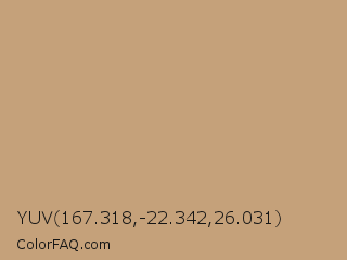 YUV 167.318,-22.342,26.031 Color is a light orange color and the nearest color is Light French Beige #c8ad7f. Hex code #c5a17a and RGB value is rgb(197,161,122). In RGB color space, this color is composed of 77% red, 63% green, 48% blue, In CMYK color space, this color is composed of 0% cyan, 18% magenta, 38% yellow , 23% black , In HSL color space, this color has a hue angle of 31° , 39% saturation and 63% lightness.