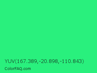 YUV 167.389,-20.898,-110.843 Color is a normal green color and the nearest color is UFO Green #3cd070. Hex code #29f07d and RGB value is rgb(41,240,125). In RGB color space, this color is composed of 16% red, 94% green, 49% blue, In CMYK color space, this color is composed of 83% cyan, 0% magenta, 48% yellow , 6% black , In HSL color space, this color has a hue angle of 145° , 87% saturation and 55% lightness.