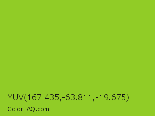 YUV 167.435,-63.811,-19.675 Color is a normal green color and the nearest color is Atlantis #97cd2d. Hex code #91cc26 and RGB value is rgb(145,204,38). In RGB color space, this color is composed of 57% red, 80% green, 15% blue, In CMYK color space, this color is composed of 29% cyan, 0% magenta, 81% yellow , 20% black , In HSL color space, this color has a hue angle of 81° , 69% saturation and 47% lightness.