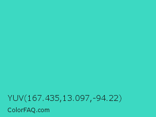 YUV 167.435,13.097,-94.22 Color is a normal cyan color and the nearest color is Turquoise PWG #30d5c8. Hex code #3cd9c2 and RGB value is rgb(60,217,194). In RGB color space, this color is composed of 24% red, 85% green, 76% blue, In CMYK color space, this color is composed of 72% cyan, 0% magenta, 11% yellow , 15% black , In HSL color space, this color has a hue angle of 171° , 67% saturation and 54% lightness.