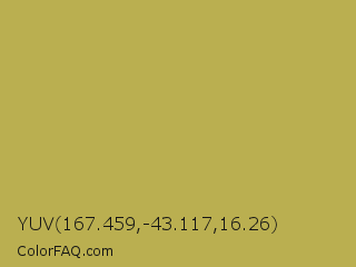YUV 167.459,-43.117,16.26 Color is a normal yellow color and the nearest color is Olive Green #b5b35c. Hex code #baaf50 and RGB value is rgb(186,175,80). In RGB color space, this color is composed of 73% red, 69% green, 31% blue, In CMYK color space, this color is composed of 0% cyan, 6% magenta, 57% yellow , 27% black , In HSL color space, this color has a hue angle of 54° , 43% saturation and 52% lightness.