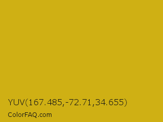 YUV 167.485,-72.71,34.655 Color is a normal yellow color and the nearest color is Galliano #dcb20c. Hex code #cfb014 and RGB value is rgb(207,176,20). In RGB color space, this color is composed of 81% red, 69% green, 8% blue, In CMYK color space, this color is composed of 0% cyan, 15% magenta, 90% yellow , 19% black , In HSL color space, this color has a hue angle of 50° , 82% saturation and 45% lightness.