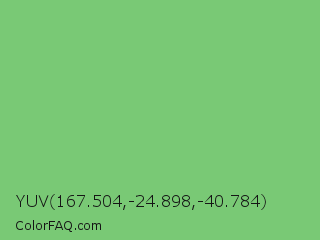 YUV 167.504,-24.898,-40.784 Color is a light green color and the nearest color is Iguana Green #71bc78. Hex code #79c975 and RGB value is rgb(121,201,117). In RGB color space, this color is composed of 47% red, 79% green, 46% blue, In CMYK color space, this color is composed of 40% cyan, 0% magenta, 42% yellow , 21% black , In HSL color space, this color has a hue angle of 117° , 44% saturation and 62% lightness.