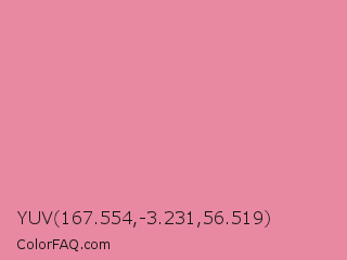 YUV 167.554,-3.231,56.519 Color is a light rose color and the nearest color is Carissma #ea88a8. Hex code #e888a1 and RGB value is rgb(232,136,161). In RGB color space, this color is composed of 91% red, 53% green, 63% blue, In CMYK color space, this color is composed of 0% cyan, 41% magenta, 31% yellow , 9% black , In HSL color space, this color has a hue angle of 344° , 68% saturation and 72% lightness.