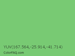 YUV 167.564,-25.914,-41.714 Color is a light green color and the nearest color is Mantis #74c365. Hex code #78ca73 and RGB value is rgb(120,202,115). In RGB color space, this color is composed of 47% red, 79% green, 45% blue, In CMYK color space, this color is composed of 41% cyan, 0% magenta, 43% yellow , 21% black , In HSL color space, this color has a hue angle of 117° , 45% saturation and 62% lightness.