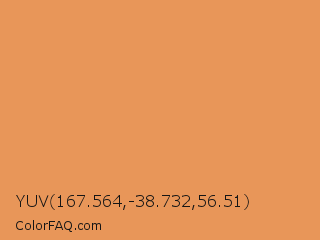 YUV 167.564,-38.732,56.51 Color is a light orange color and the nearest color is Big Foot Feet #e88e5a. Hex code #e89659 and RGB value is rgb(232,150,89). In RGB color space, this color is composed of 91% red, 59% green, 35% blue, In CMYK color space, this color is composed of 0% cyan, 35% magenta, 62% yellow , 9% black , In HSL color space, this color has a hue angle of 26° , 76% saturation and 63% lightness.