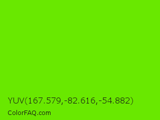 YUV 167.579,-82.616,-54.882 Color is a normal green color and the nearest color is Bright Green #66ff00. Hex code #69e800 and RGB value is rgb(105,232,-0). In RGB color space, this color is composed of 41% red, 91% green, 0% blue, In CMYK color space, this color is composed of 55% cyan, 0% magenta, 100% yellow , 9% black , In HSL color space, this color has a hue angle of 93° , 100% saturation and 45% lightness.