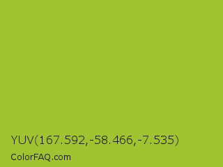 YUV 167.592,-58.466,-7.535 Color is a normal lime color and the nearest color is Android Green #a4c639. Hex code #9fc331 and RGB value is rgb(159,195,49). In RGB color space, this color is composed of 62% red, 76% green, 19% blue, In CMYK color space, this color is composed of 18% cyan, 0% magenta, 75% yellow , 24% black , In HSL color space, this color has a hue angle of 75° , 60% saturation and 48% lightness.