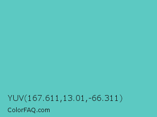 YUV 167.611,13.01,-66.311 Color is a normal cyan color and the nearest color is Downy #6fd0c5. Hex code #5cc9c2 and RGB value is rgb(92,201,194). In RGB color space, this color is composed of 36% red, 79% green, 76% blue, In CMYK color space, this color is composed of 54% cyan, 0% magenta, 3% yellow , 21% black , In HSL color space, this color has a hue angle of 176° , 50% saturation and 57% lightness.