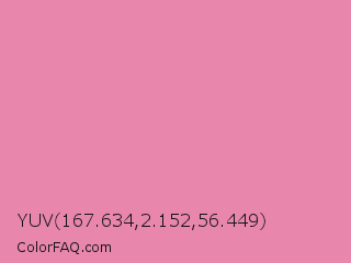 YUV 167.634,2.152,56.449 Color is a light rose color and the nearest color is Carissma #ea88a8. Hex code #e886ac and RGB value is rgb(232,134,172). In RGB color space, this color is composed of 91% red, 53% green, 67% blue, In CMYK color space, this color is composed of 0% cyan, 42% magenta, 26% yellow , 9% black , In HSL color space, this color has a hue angle of 337° , 68% saturation and 72% lightness.