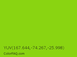 YUV 167.644,-74.267,-25.998 Color is a normal green color and the nearest color is Sheen Green #8fd400. Hex code #8ad411 and RGB value is rgb(138,212,17). In RGB color space, this color is composed of 54% red, 83% green, 7% blue, In CMYK color space, this color is composed of 35% cyan, 0% magenta, 92% yellow , 17% black , In HSL color space, this color has a hue angle of 83° , 85% saturation and 45% lightness.