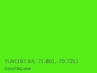 YUV 167.64,-71.801,-70.721 Color is a normal green color and the nearest color is Chlorophyll Green #4aff00. Hex code #57ed16 and RGB value is rgb(87,237,22). In RGB color space, this color is composed of 34% red, 93% green, 9% blue, In CMYK color space, this color is composed of 63% cyan, 0% magenta, 91% yellow , 7% black , In HSL color space, this color has a hue angle of 102° , 86% saturation and 51% lightness.