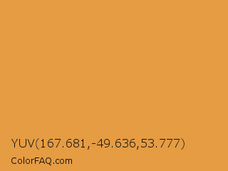 YUV 167.681,-49.636,53.777 Color is a normal orange color and the nearest color is Tigers Eye #e08d3c. Hex code #e59c43 and RGB value is rgb(229,156,67). In RGB color space, this color is composed of 90% red, 61% green, 26% blue, In CMYK color space, this color is composed of 0% cyan, 32% magenta, 71% yellow , 10% black , In HSL color space, this color has a hue angle of 33° , 76% saturation and 58% lightness.