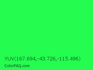 YUV 167.694,-43.726,-115.496 Color is a normal green color and the nearest color is Malachite #0bda51. Hex code #24fc4f and RGB value is rgb(36,252,79). In RGB color space, this color is composed of 14% red, 99% green, 31% blue, In CMYK color space, this color is composed of 86% cyan, 0% magenta, 69% yellow , 1% black , In HSL color space, this color has a hue angle of 132° , 97% saturation and 56% lightness.