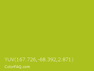 YUV 167.726,-68.392,2.871 Color is a normal yellow color and the nearest color is Acid Green #b0bf1a. Hex code #abc11d and RGB value is rgb(171,193,29). In RGB color space, this color is composed of 67% red, 76% green, 11% blue, In CMYK color space, this color is composed of 11% cyan, 0% magenta, 85% yellow , 24% black , In HSL color space, this color has a hue angle of 68° , 74% saturation and 44% lightness.
