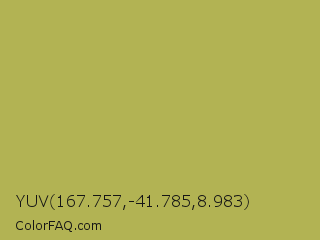 YUV 167.757,-41.785,8.983 Color is a normal yellow color and the nearest color is Olive Green #b5b35c. Hex code #b2b353 and RGB value is rgb(178,179,83). In RGB color space, this color is composed of 70% red, 70% green, 33% blue, In CMYK color space, this color is composed of 1% cyan, 0% magenta, 54% yellow , 30% black , In HSL color space, this color has a hue angle of 61° , 39% saturation and 51% lightness.