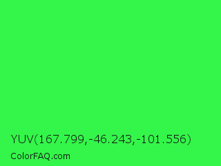 YUV 167.799,-46.243,-101.556 Color is a normal green color and the nearest color is Lime Green #32cd32. Hex code #34f54a and RGB value is rgb(52,245,74). In RGB color space, this color is composed of 20% red, 96% green, 29% blue, In CMYK color space, this color is composed of 79% cyan, 0% magenta, 70% yellow , 4% black , In HSL color space, this color has a hue angle of 127° , 91% saturation and 58% lightness.