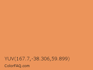 YUV 167.7,-38.306,59.899 Color is a light orange color and the nearest color is Big Foot Feet #e88e5a. Hex code #ec945a and RGB value is rgb(236,148,90). In RGB color space, this color is composed of 93% red, 58% green, 35% blue, In CMYK color space, this color is composed of 0% cyan, 37% magenta, 62% yellow , 7% black , In HSL color space, this color has a hue angle of 24° , 79% saturation and 64% lightness.