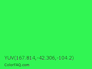 YUV 167.814,-42.306,-104.2 Color is a normal green color and the nearest color is Malachite #0bda51. Hex code #31f552 and RGB value is rgb(49,245,82). In RGB color space, this color is composed of 19% red, 96% green, 32% blue, In CMYK color space, this color is composed of 80% cyan, 0% magenta, 67% yellow , 4% black , In HSL color space, this color has a hue angle of 130° , 91% saturation and 58% lightness.