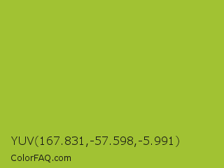YUV 167.831,-57.598,-5.991 Color is a normal lime color and the nearest color is Android Green #a4c639. Hex code #a1c233 and RGB value is rgb(161,194,51). In RGB color space, this color is composed of 63% red, 76% green, 20% blue, In CMYK color space, this color is composed of 17% cyan, 0% magenta, 74% yellow , 24% black , In HSL color space, this color has a hue angle of 74° , 58% saturation and 48% lightness.