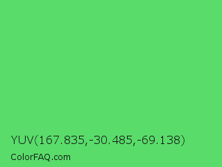 YUV 167.835,-30.485,-69.138 Color is a light green color and the nearest color is Emerald #50c878. Hex code #59dc6a and RGB value is rgb(89,220,106). In RGB color space, this color is composed of 35% red, 86% green, 42% blue, In CMYK color space, this color is composed of 60% cyan, 0% magenta, 52% yellow , 14% black , In HSL color space, this color has a hue angle of 128° , 65% saturation and 61% lightness.