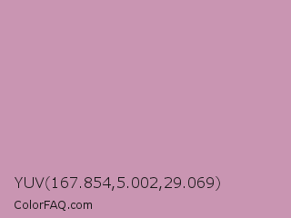YUV 167.854,5.002,29.069 Color is a light magenta color and the nearest color is Viola #cb8fa9. Hex code #c995b2 and RGB value is rgb(201,149,178). In RGB color space, this color is composed of 79% red, 58% green, 70% blue, In CMYK color space, this color is composed of 0% cyan, 26% magenta, 11% yellow , 21% black , In HSL color space, this color has a hue angle of 327° , 33% saturation and 69% lightness.