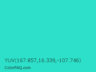 YUV 167.857,16.339,-107.746 Color is a normal cyan color and the nearest color is Turquoise PWG #30d5c8. Hex code #2de0c9 and RGB value is rgb(45,224,201). In RGB color space, this color is composed of 18% red, 88% green, 79% blue, In CMYK color space, this color is composed of 80% cyan, 0% magenta, 10% yellow , 12% black , In HSL color space, this color has a hue angle of 172° , 74% saturation and 53% lightness.