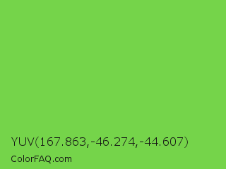 YUV 167.863,-46.274,-44.607 Color is a normal green color and the nearest color is Mantis #74c365. Hex code #75d44a and RGB value is rgb(117,212,74). In RGB color space, this color is composed of 46% red, 83% green, 29% blue, In CMYK color space, this color is composed of 45% cyan, 0% magenta, 65% yellow , 17% black , In HSL color space, this color has a hue angle of 101° , 62% saturation and 56% lightness.