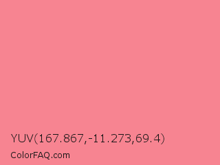 YUV 167.867,-11.273,69.4 Color is a light red color and the nearest color is Tulip #ff878d. Hex code #f78491 and RGB value is rgb(247,132,145). In RGB color space, this color is composed of 97% red, 52% green, 57% blue, In CMYK color space, this color is composed of 0% cyan, 47% magenta, 41% yellow , 3% black , In HSL color space, this color has a hue angle of 353° , 88% saturation and 74% lightness.