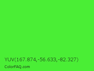 YUV 167.874,-56.633,-82.327 Color is a normal green color and the nearest color is Neon Green #39ff14. Hex code #4aee35 and RGB value is rgb(74,238,53). In RGB color space, this color is composed of 29% red, 93% green, 21% blue, In CMYK color space, this color is composed of 69% cyan, 0% magenta, 78% yellow , 7% black , In HSL color space, this color has a hue angle of 113° , 84% saturation and 57% lightness.