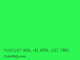 YUV 167.906,-41.859,-107.789 Color is a normal green color and the nearest color is Malachite #0bda51. Hex code #2df753 and RGB value is rgb(45,247,83). In RGB color space, this color is composed of 18% red, 97% green, 33% blue, In CMYK color space, this color is composed of 82% cyan, 0% magenta, 66% yellow , 3% black , In HSL color space, this color has a hue angle of 131° , 93% saturation and 57% lightness.