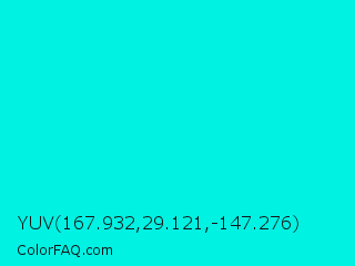 YUV 167.932,29.121,-147.276 Color is a normal cyan color and the nearest color is Bright Turquoise #08e8de. Hex code #00f2e3 and RGB value is rgb(0,242,227). In RGB color space, this color is composed of 0% red, 95% green, 89% blue, In CMYK color space, this color is composed of 100% cyan, 0% magenta, 6% yellow , 5% black , In HSL color space, this color has a hue angle of 176° , 100% saturation and 47% lightness.