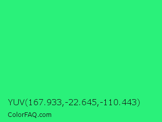 YUV 167.933,-22.645,-110.443 Color is a normal green color and the nearest color is UFO Green #3cd070. Hex code #2af17a and RGB value is rgb(42,241,122). In RGB color space, this color is composed of 16% red, 95% green, 48% blue, In CMYK color space, this color is composed of 83% cyan, 0% magenta, 49% yellow , 5% black , In HSL color space, this color has a hue angle of 144° , 88% saturation and 55% lightness.